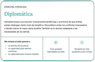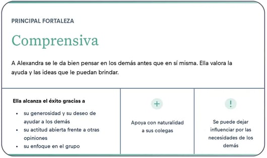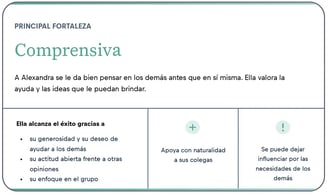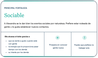 Mira la puntuación de Alexandra en capacidades para relacionarse y para liderar equipos, aunque tampoco se le da mal ayudar a las personas y captar colaboradores.