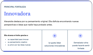La puntuación en Creatividad de Alexandra mide hasta qué punto su razonamiento es original e innovador a la vez que lógico y analítico. Es de mente abierta, disfruta de la novedad y el cambio, a menudo aporta ideas nuevas e interesantes.